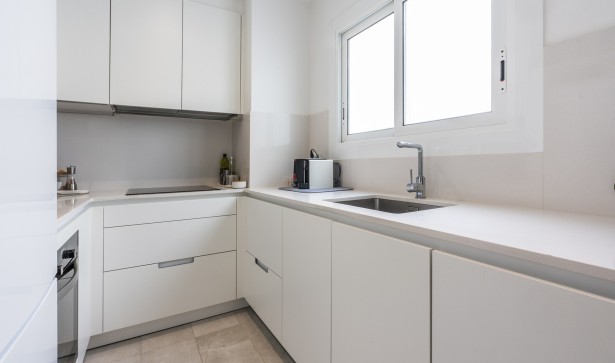 Su moderna cocina, completamente equipada con electrodomésticos de alta gama y decorada con una elegante mesa de mármol para seis personas, se integra en el salón-comedor con salida a una terraza de 5m2 con cristalera de cierre automático y con chimenea eléctrica ideal para todas las estaciones del año.